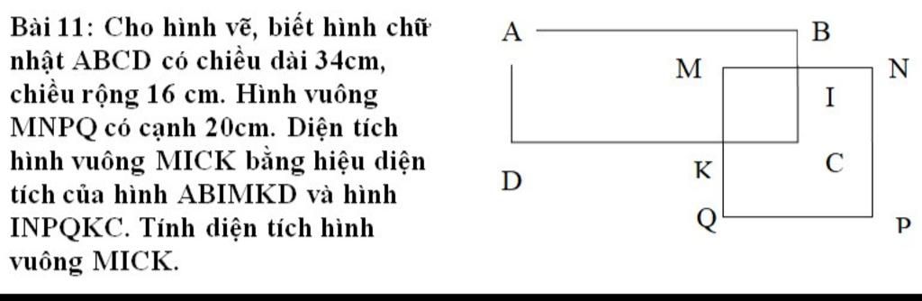 Cho hình vẽ, biết hình chữ nhật ABCD có chiều dài 34cm, chiều rộng 16 cm. Hình vuông MNPQ có cạnh 20cm. Diện tích hình vuông MICK bằng hiệu diện tích của hình