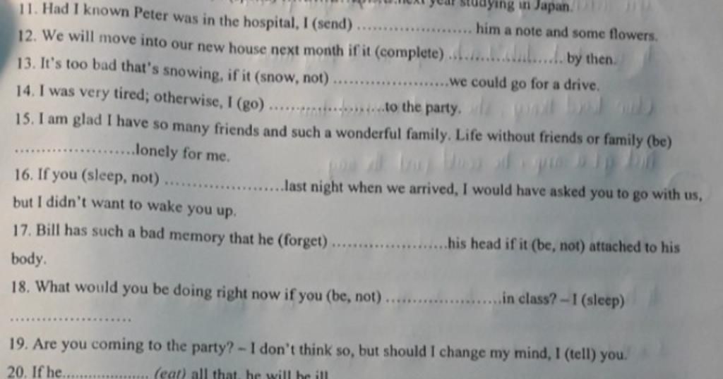 Các bạn giúp mình làm và giải thích nha! Thanks!!........aying in Japan. 11. Had I known Peter was in the hospital, I (send) him a note and some flowers. 12. W