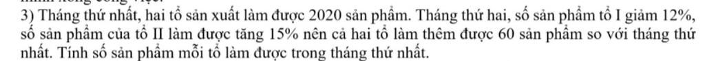Vì tháng thứ hai , số sản phẩm tổ `I` giảm `12%` , số sản phẩm tổ `II` tăng `15%` nên cả hai tổ làm thêm được `60` sản phẩm