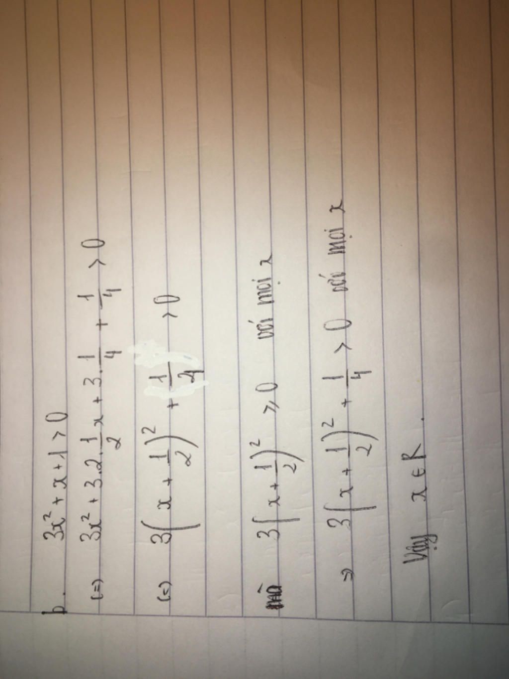 b) `3x^2+x+1>0` (Luôn đúng `\forall x)`