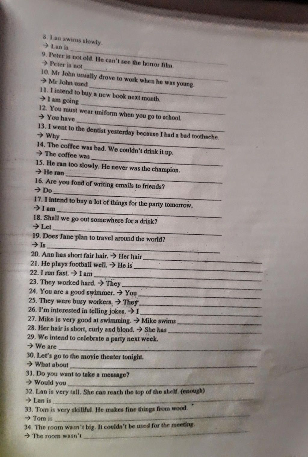 8. 1 an swims slowly. Lan is 9. Peter is not old. He can't see the honor film. > Peter is not 10. Mr John usually drove to work when he was young. Mr John