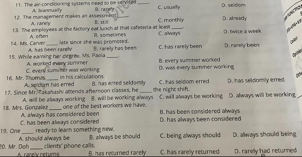 11. The air-conditioning systems need to be serviced A. biannually B. rarely 12. The management makes an assessment C. usually D. seldom A. rarely B. still