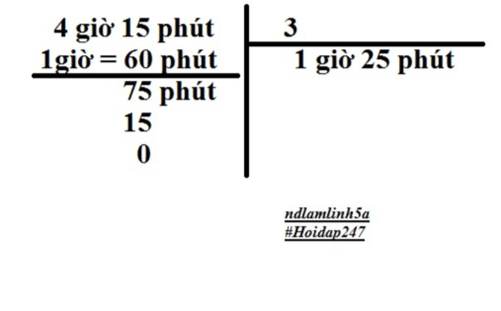 `⇒ 4` giờ `15` phút `: 3 = 255` phút `: 3 = 85` phút