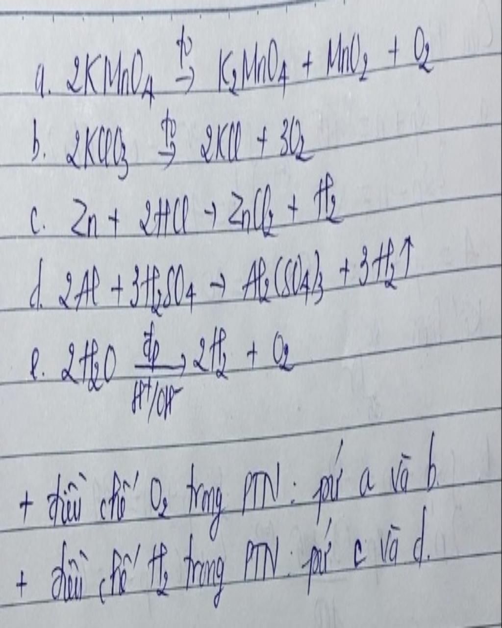 $b)$ $2KClO_3$ $\xrightarrow[MnO_2]{t^o}$ $2KCl+3O_2↑$