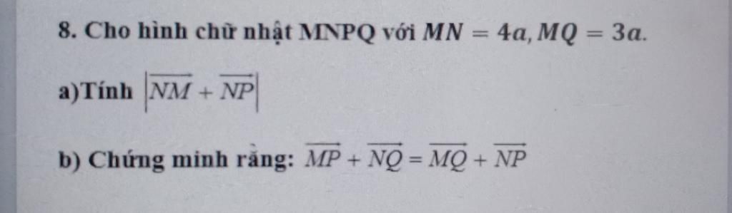 8. Cho hình chữ nhật MNPQ với MN = 4a, MQ = 3a. %3D %3D a)Tính NM + NP b) Chứng minh răng: MP + NQ = MQ + NP %3D