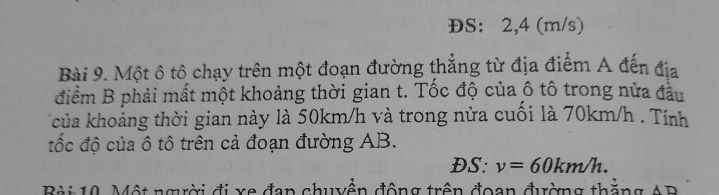 \({{v}_{tb}}=\dfrac{S}{t}=\dfrac{{{v}_{1}}.\dfrac{t}{2}+{{v}_{2}}.\frac{t}{2}}{t}=\dfrac{50.\dfrac{t}{2}+70\dfrac{t}{2}}{t}=60km/h\)