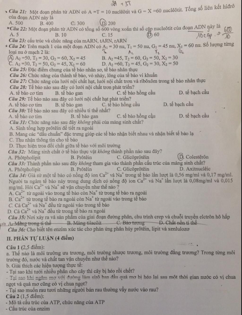 22-12000nu, câu này m thấy đáp án ko đúng lắm: 600 vòng xoắn thì có số nu là 600 x 20 = 12000 nu rồi -> số cặp nu = 6000 . Nếu câu hỏi ngược lại là 600 cặp nu -> số vòng xoắn sẽ là 60
