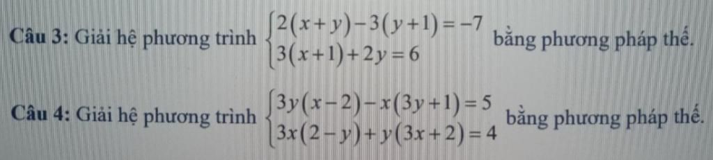 J2(x+y)-3(y+1)=-7 3(x+1)+2y=6 Câu 3: Giải hệ phương trình bằng phương pháp thế. 3y(x-2)-x(3y+1) =5 3x(2-y)+y(3x+ 2) = 4 Câu 4: Giải hệ phương trình bằng ph