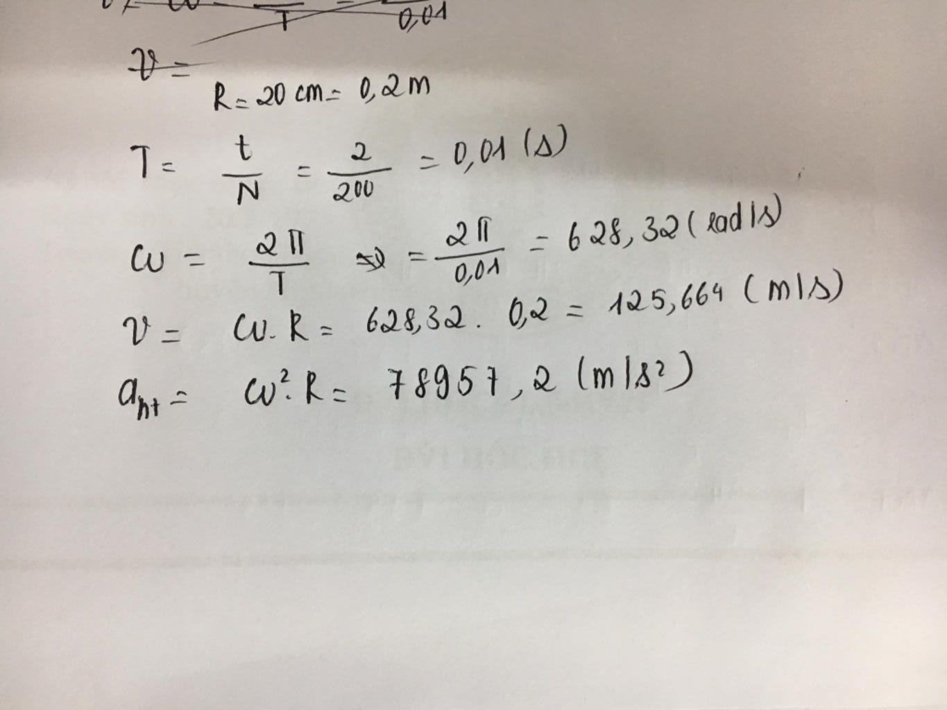 $T = 0,01s;\omega = 200\pi \left( {rad/s} \right)v = 40\pi \left( {m/s} \right);a = 78956,8m/{s^2}$