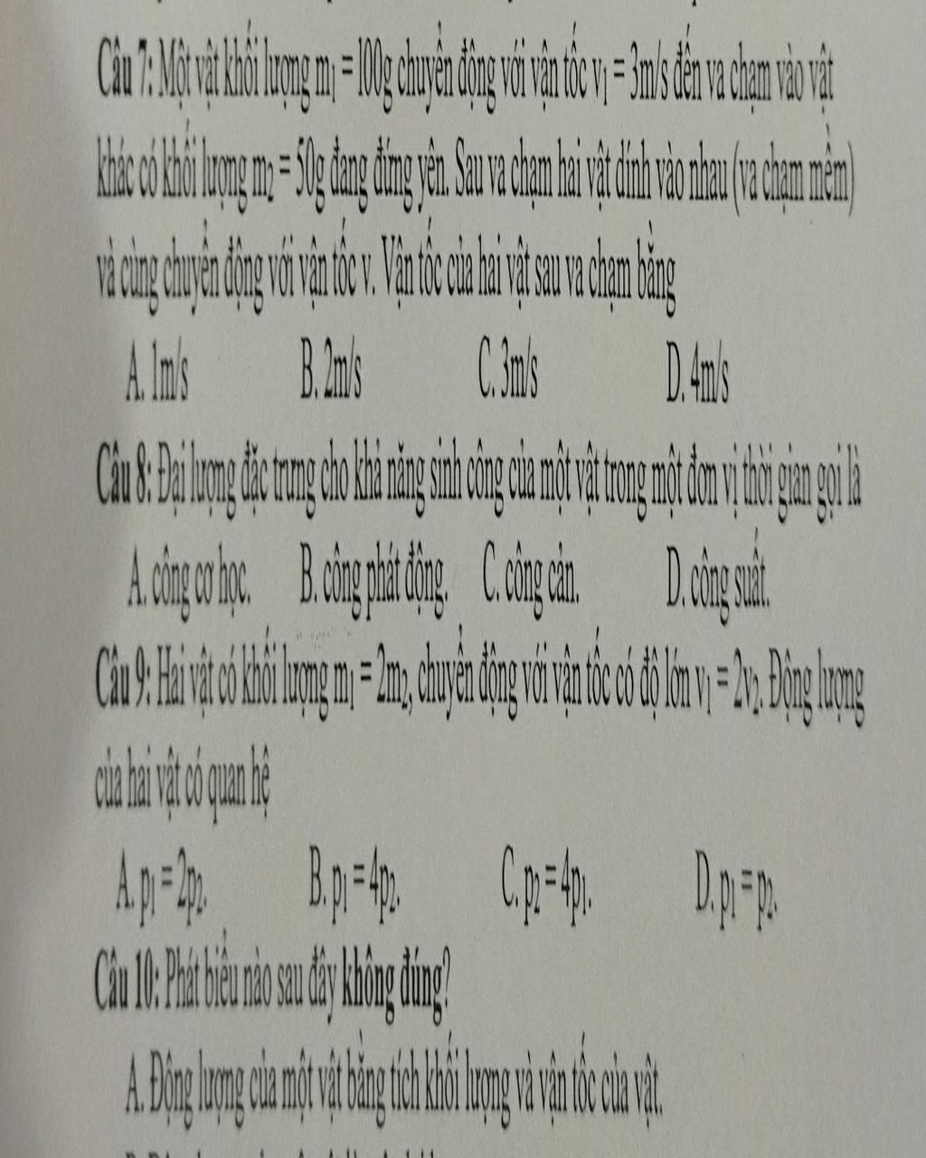 ⇔ $v=\dfrac{m_1v_1}{m_1+m_2}=\dfrac{0,1.3}{0,1+0,05}=2 \ (m/s)$
