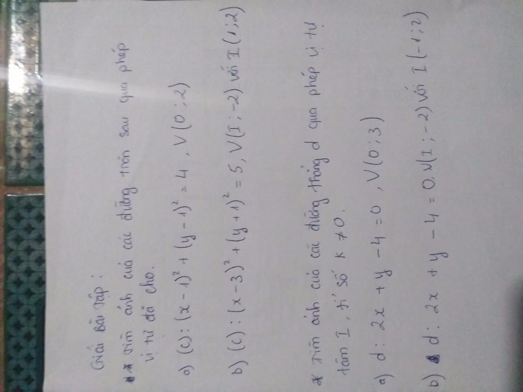** dim anh cua cac dutng trn Sow qua phop vi từ đà cho. B) (c): (x-3)'+(y)" = 5, V(I;-2) wi I(12) * Tim anh cuó cac đucng trong d qua phép i tư tam 1, ti'