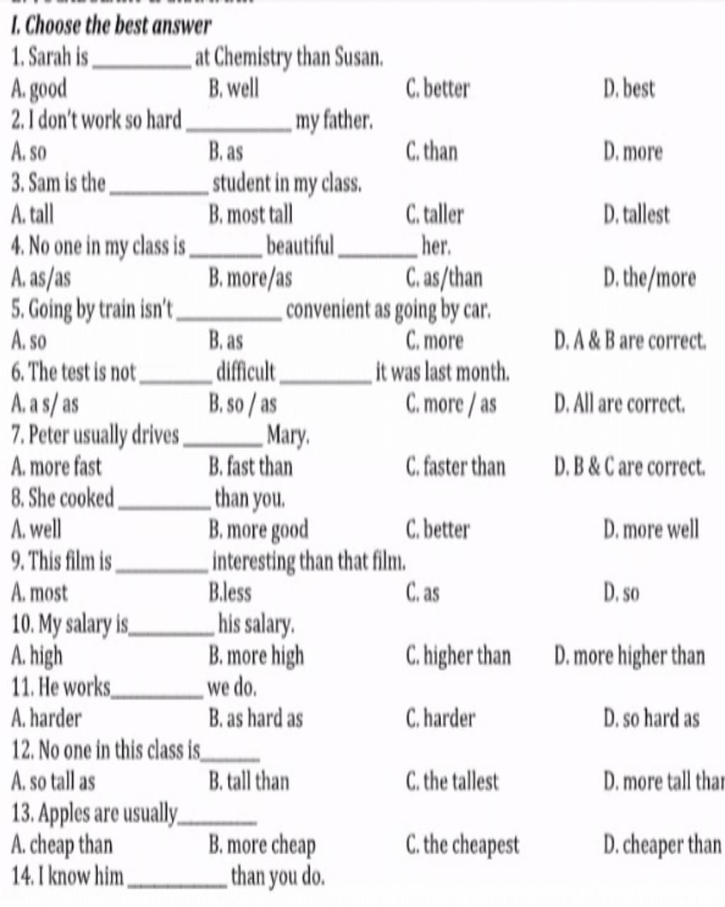 1. Choose the best answer 1. Sarah is, A. good 2. I don't work so hard, A. so 3. Sam is the, A. tall ,at Chemistry than Susan. B. well C. better D. best my
