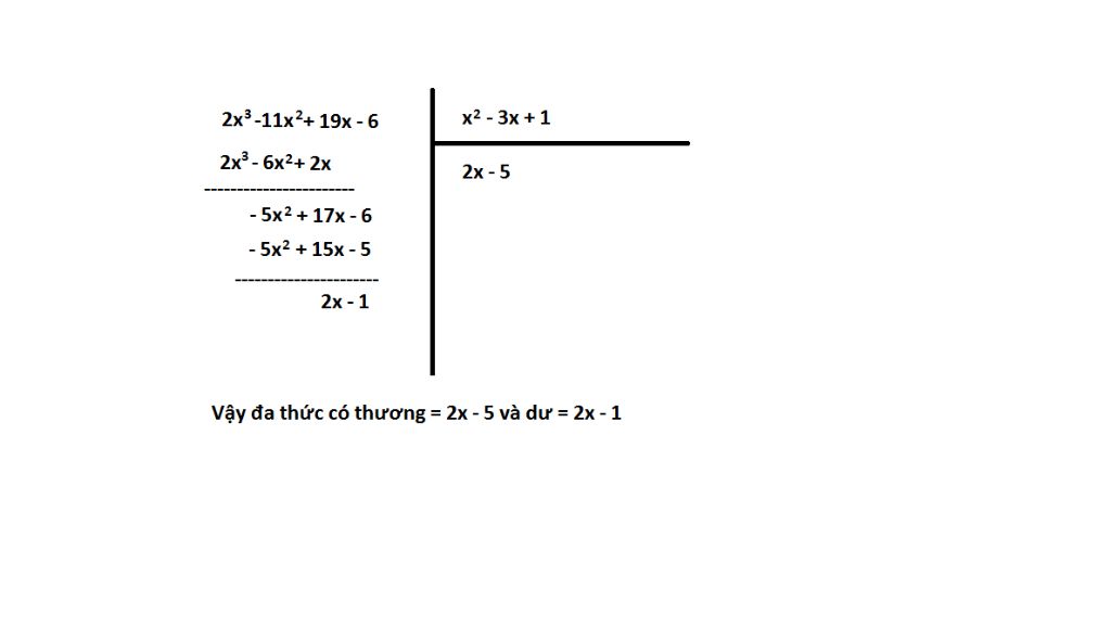 Vậy đa thức thương là $C = 2x - 5$ và đa thức dư là $R = 2x - 1$