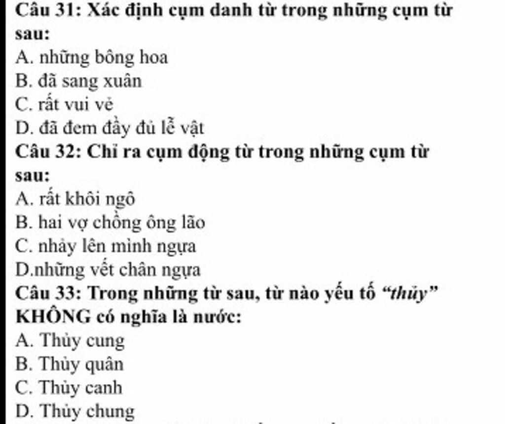 Câu 31:Xác định cụm danh từ trong những danh từ sau