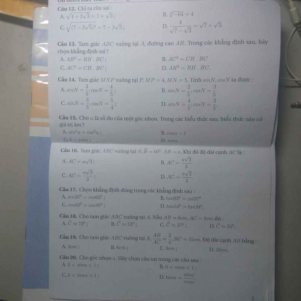 Cầu 12. Chỉ ra câu sai : A. V4+2/3= 1+ V3; B. -64 = 4 4. C. V(7- 3V5)2 = 7-3V5; D. V7 - V3 V7+ V3. Câu 13. Tam giác ABC vuông tại A, dưong cao AH. Trong cá