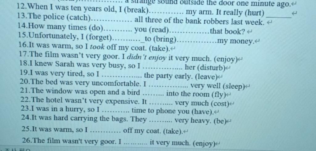 nge sound outside the door one minute ago.e my arm. It really (hurt) all three of the bank robbers last week. 12. When I was ten years old, I (break).. 13.