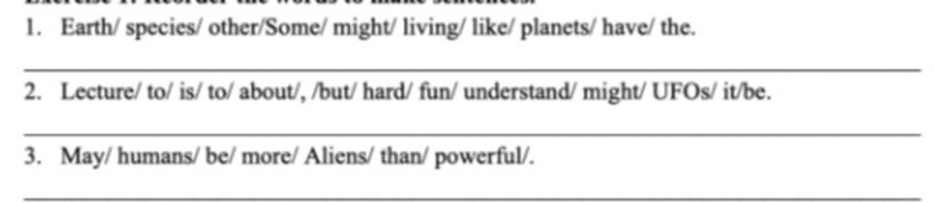 1. Earth/ species/ other/Some/ might/ living/ like/ planets/have/ the. 2. Lecture/ to/ is/ to/ about/, /but/ hard/ fun/ understand/ might/ UFOS/ it/be. 3.