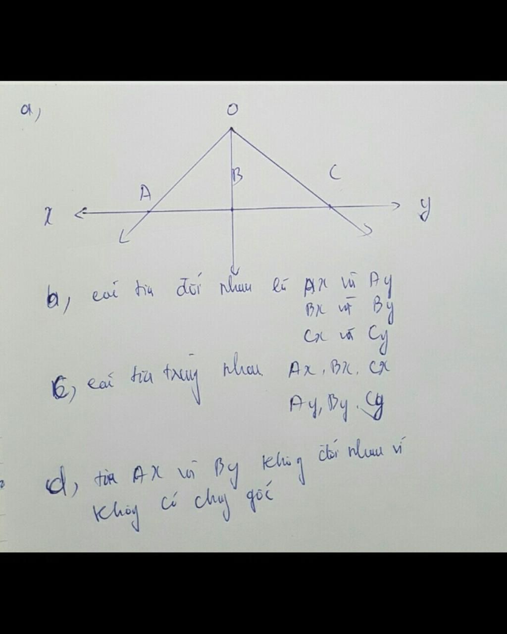 Bài 1. Cho đường thẳng xy. Lấy điêm A, B, C thuộc xy theo thứ tự đó. Điểm O không thuộc đường thắng xy. 1) Vẽ các tia OA, OB, OC. 2) Kể tên những tia đổi n