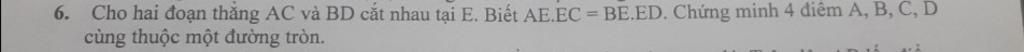 Cho hai đoạn thăng AC và BD cắt nhau tại E. Biết AE.EC = BE.ED. Chứng minh 4 điêm A, B, C, D cùng thuộc một đường tròn. 6.