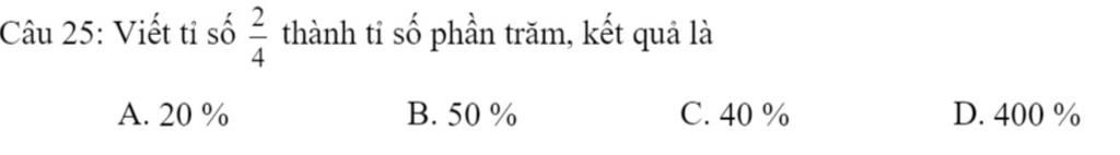 Viết tỉ số `2/4` thành tỉ số phần trăm ta được: