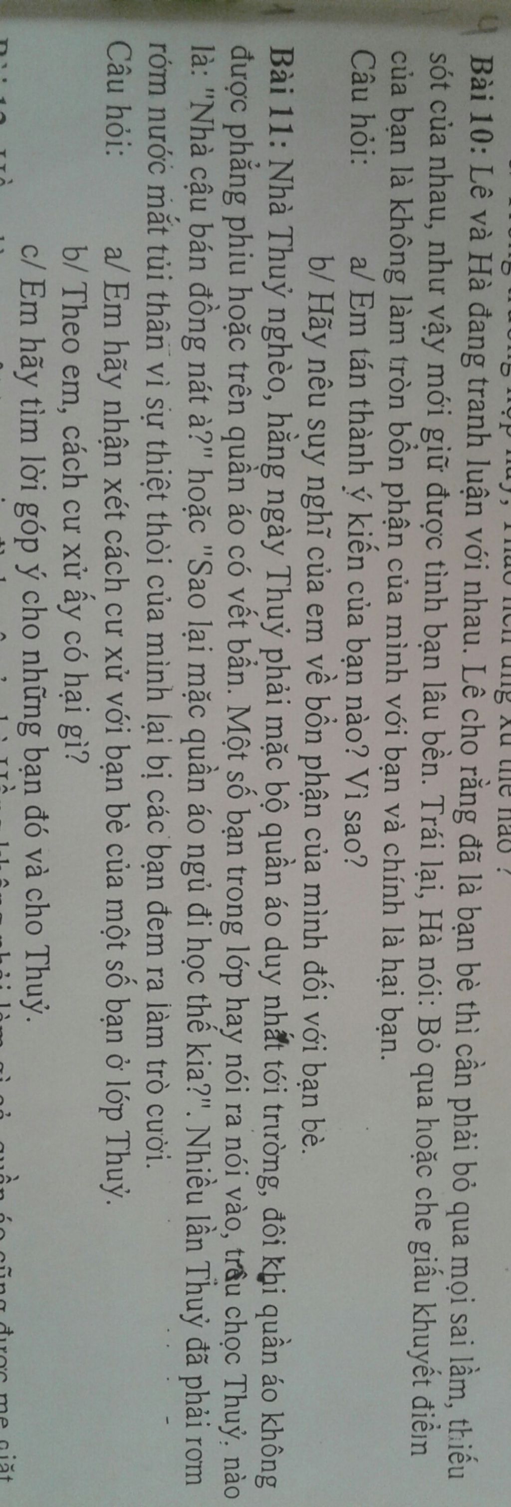 Bài 10:a/ Em tán thành với ý kiến của bạn Hà. Vì nếu đã là bạn của nhau thì phải giúp đỡ chỉ ra những thiếu sót của nhau để cùng nhau rèn luyện trở thành công dân tốt cho đất nước.