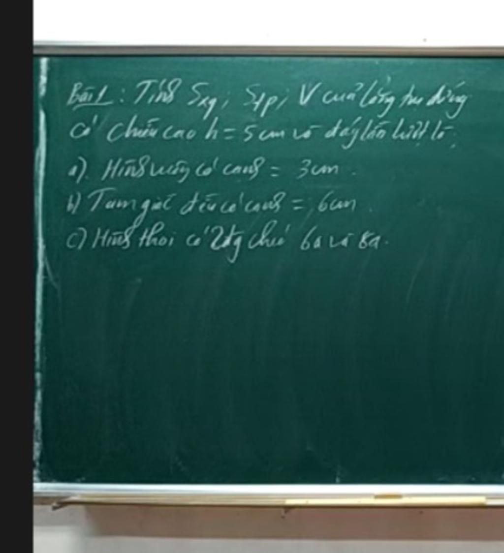 Tính Sxq; Stp; V của lăn trụ đứng có chiều cao h=5 cm và đáy lần lượt là a) Hình vuông có cạnh = 3cm b) Tam giác đều có cạnh= 6cm c) Hình thoi có 2 đường chéo