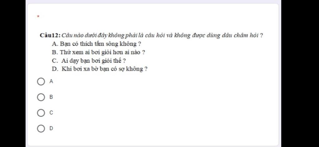 Câu 12: Câu nào dưới đây không phải là câu hỏi và không được dùng dấu chấm hỏi?
