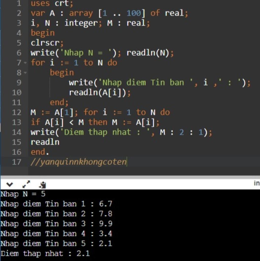 write ('Nhap diem tin cua cac ban:'); readln (N);