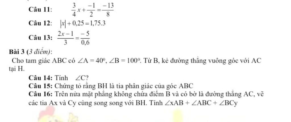 3 -1 -13 Câu 11: 4 8. Câu 12: x| +0,25 = 1,75.3 2x – 1 - 5 Câu 13: 3 0,6 Bài 3 (3 điểm): Cho tam giác ABC có ZA = 40°, ZB = 100°. Từ B, kẻ đường thẳng vuôn