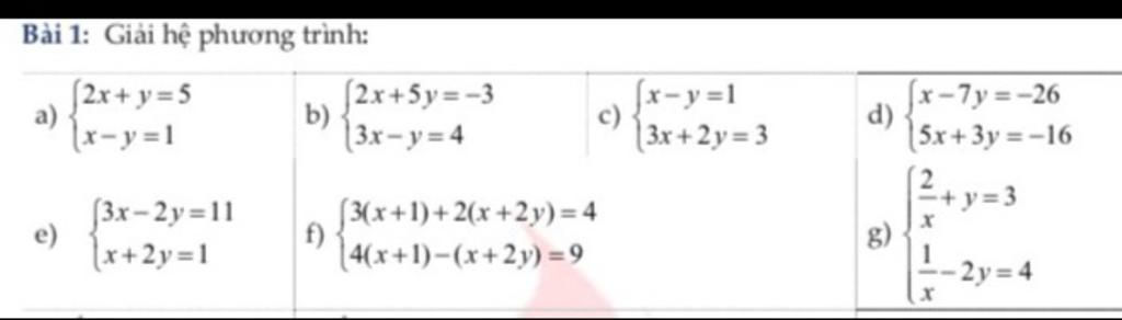 ai giải giúp mình nhanh nên với ạ mình chuẩn bị đi học :(Bài 1: Giải hệ phương trình: [2x+ y=5 [2x+5y=-3 (x-y =1 c) 3x +2y = 3 fx-7y=-26 а) b) d) x-y=1 [3x-y=