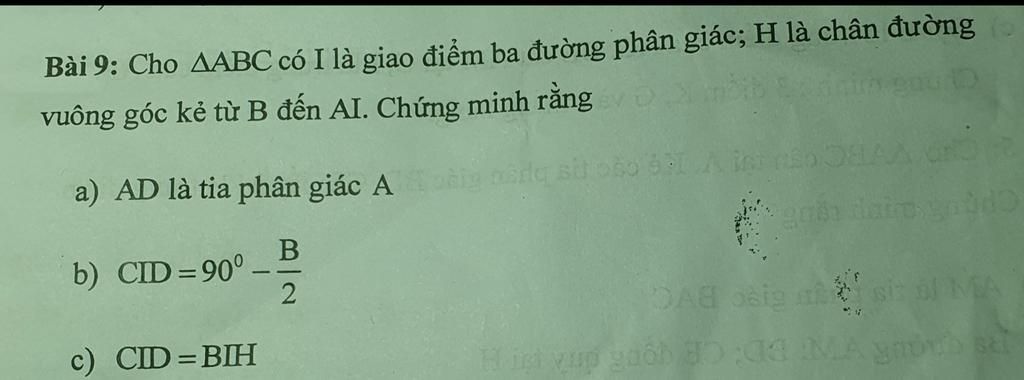 Bài 9: Cho AABC có I là giao điểm ba đường phân giác; H là chân đường vuông góc kẻ từ B đến AI. Chứng minh rằng a) AD là tia phân giác A b) CID=90° DA ig a