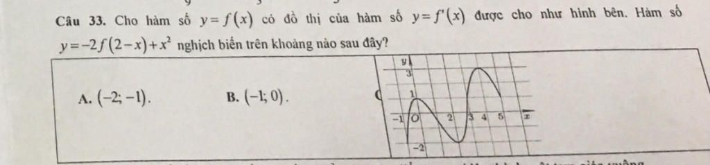 Câu 33. Cho hàm số y= f(x) có đo thi của hàm số y= f'(x) được cho như hình bên. Hàm số y=-2f(2-x)+x nghịch biển trên khoàng nào sau đây? A. (-2; -1). B. (-