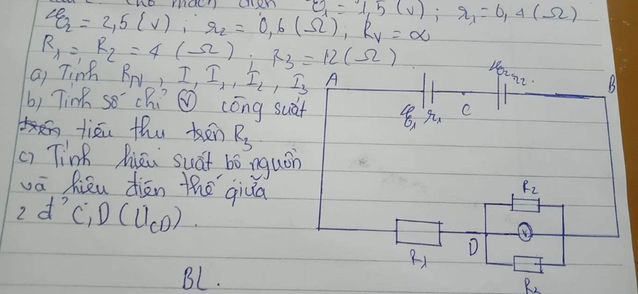 E= 4,5 lu); 2- 6, 4 (52) E=2,5[v) ;' aza 0,6 (S), Ry zo0 Ry %3D -4(52) I, I,, It, Is A R3=12(52) la Tinh By, I, I,, Î, , î. b, Tinh so chi ☺ céng suiet cón