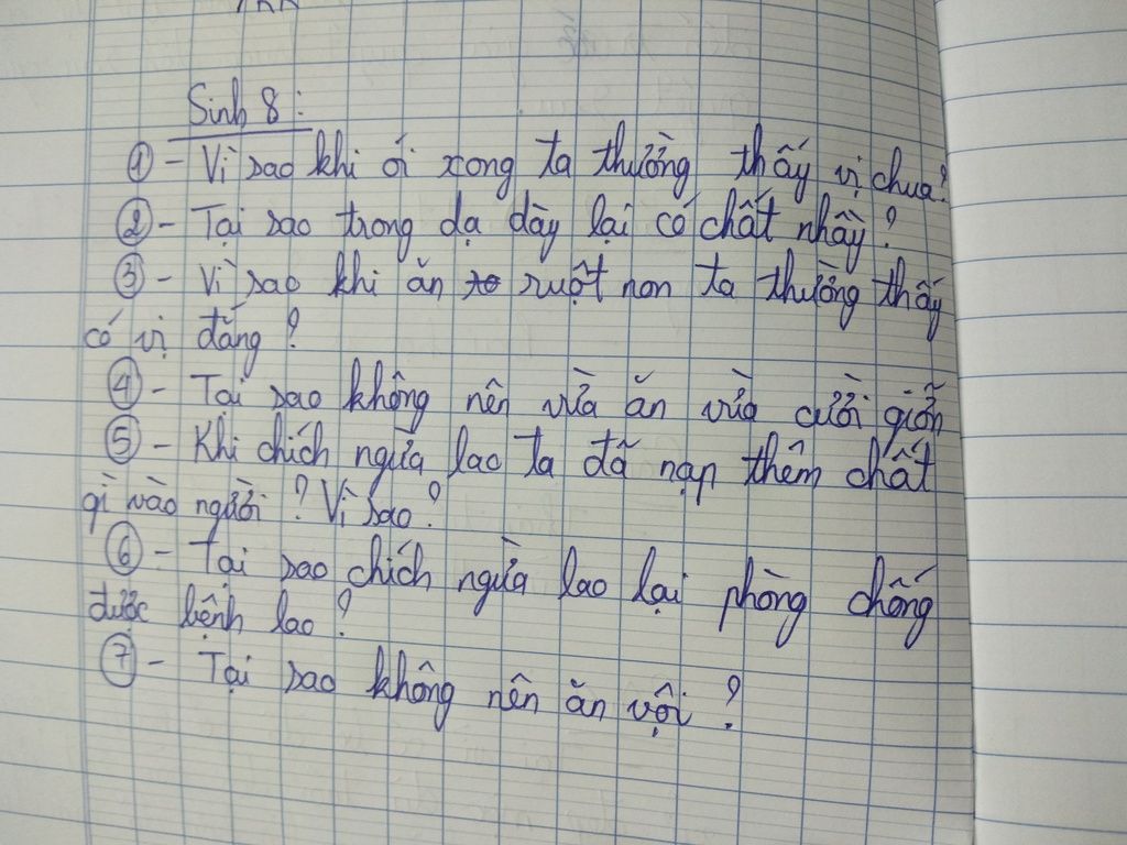 4. vì khi cười làm thanh quản mở => thức ăn có thể rơi vào thanh quản => ho, sặc