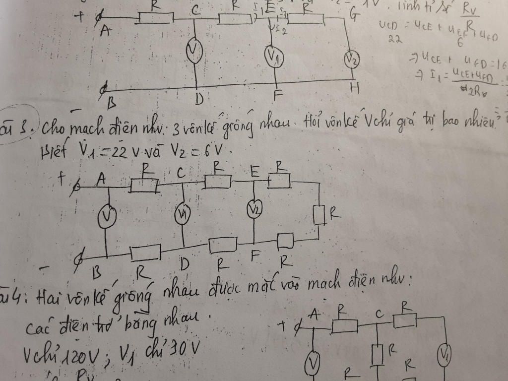 {U_{{V_1}}} = 2U + {U_{{V_2}}} = 22 \Leftrightarrow {I_{{V_1}}}.{R_V} = 2R.{I_1} + 6 = 22\\