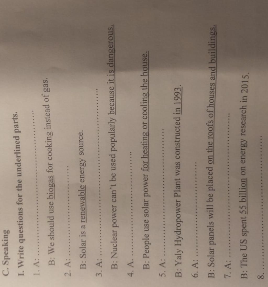 C. Speaking I. Write questions for the underlined parts. 1. A: B: We should use biogas for cooking instead of gas. 2. A: B: Solar is a renewable energy sou