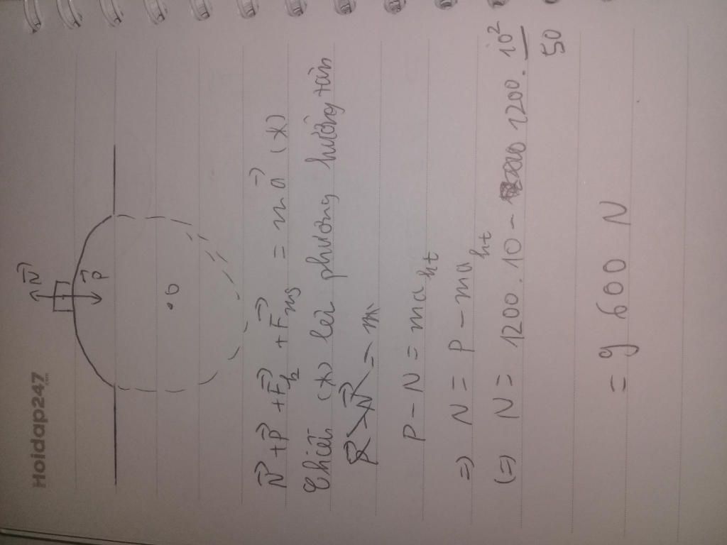 \Rightarrow N = mg - m\frac{{{v^2}}}{R} = 1200.\left( {10 - \frac{{{{10}^2}}}{{50}}} \right) = 9600N