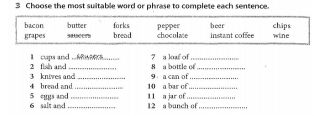 3 Choose the most suitable word or phrase to complete each sentence. bacon butter forks beer chips реррer chocolate grapes saucers bread instant coffee win