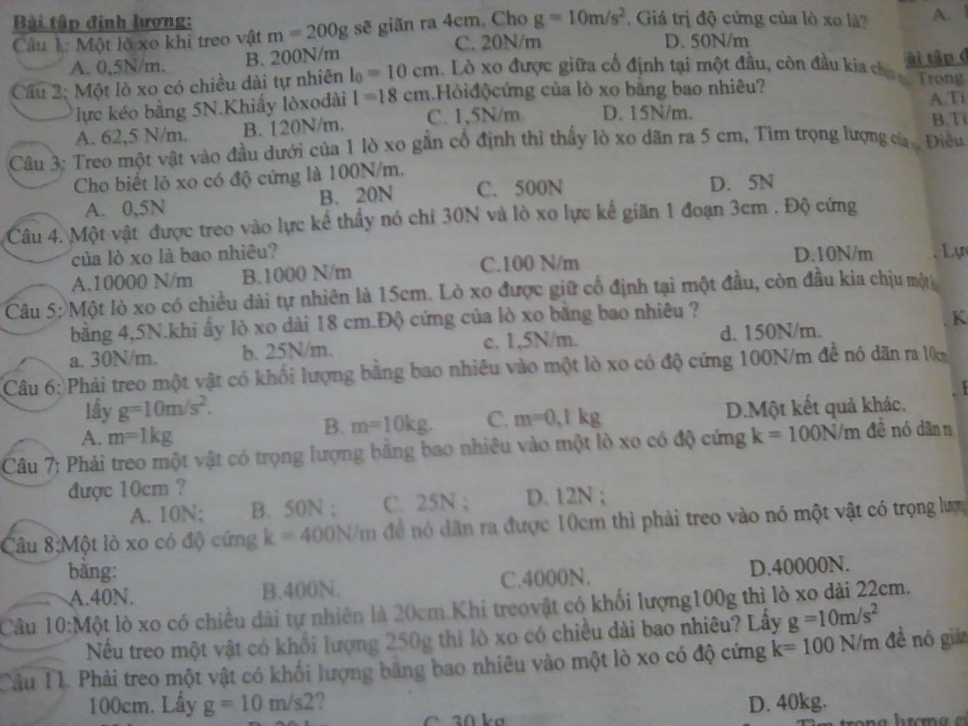 Bài tập định lượng: Cầu 1: Một là xo khi treo vật m 200g sẽ giân ra 4cm. Chog=10m/s. Giá trị độ cứng của là vo làn A. 0,5N/m. Cầu 2; Một lò xo có chiều dài