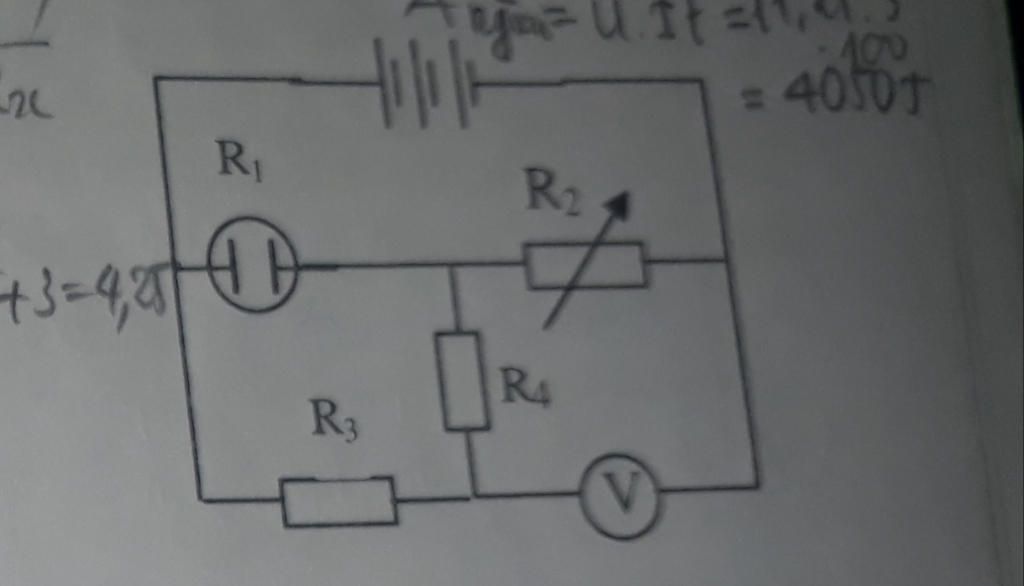 Cho mạch điện như hình E = 4V, r = 0,2 (Ohm), R1 = 12 (Ohm), R3 = 2 (Ohm), R4 = 4 (Ohm) a) R2 = 3,4 (Ohm). Tìm số chỉ vôn kế, công suất tiêu thụ trong 2 phút.