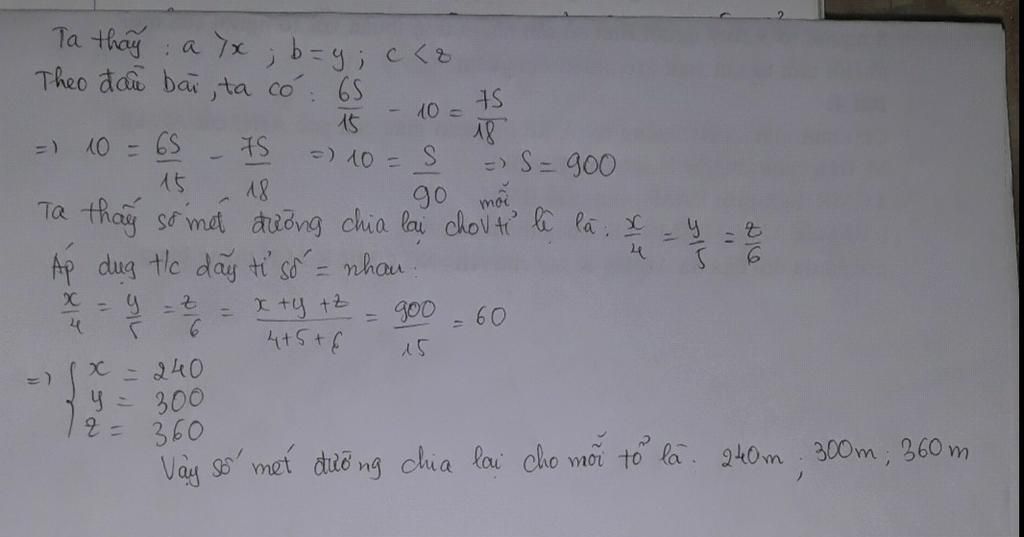 Một đơn vị công nhân sửa đường dự định phân chia số m đường cho 3 tổ theo ti lệ 5; 6;7. Vì số người thay đổi nên đã chia lại theo ti lệ 4,5; 6 . Do đó có 1