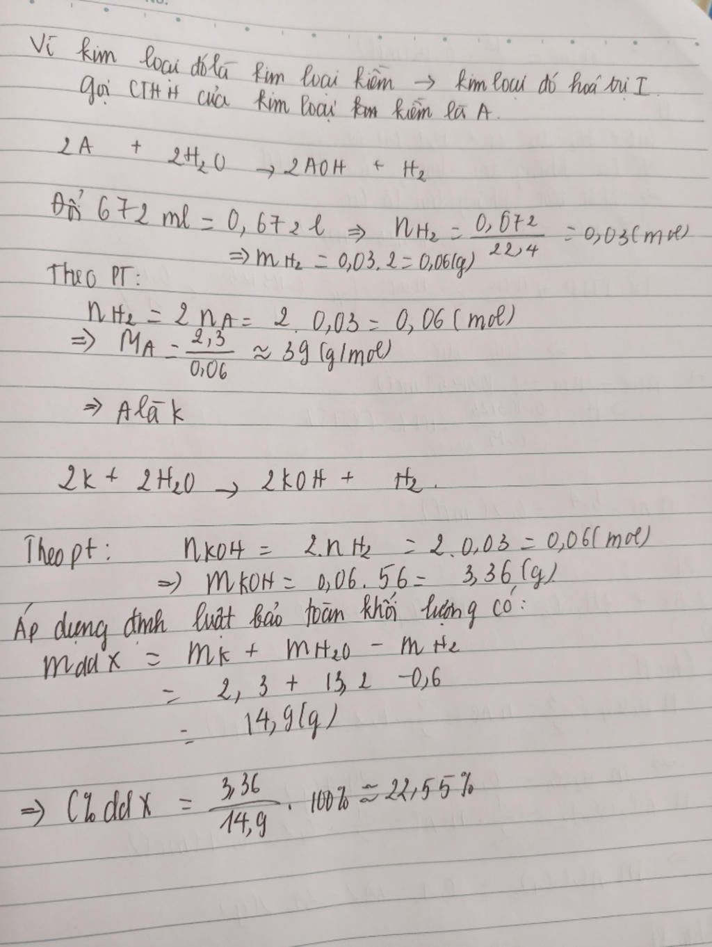 - Vì `V_{H_2}(đktc)=672(ml)=0,672(l)`