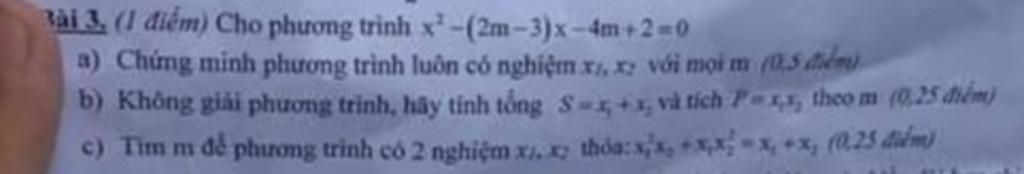 a. $\Delta = (2m - 3)^2 - 4.1.(- 4m + 2) = 4m^2 - 12m + 9 + 16m - 8 = 4m^2 + 4m + 1 = (2m + 1)^2 \geq 0$ với mọi m