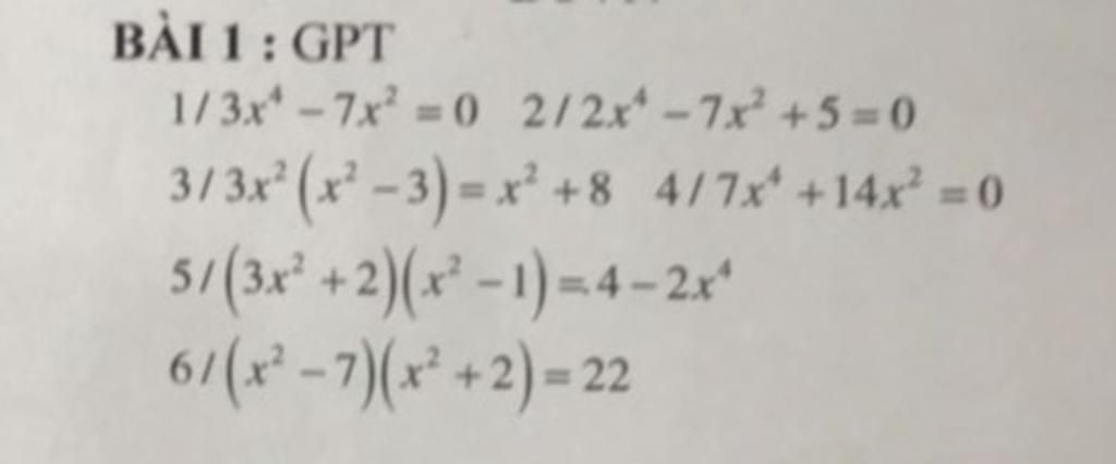 BÀI 1: GPT 1/3x-7x 0 2/2x-7x +5 = 0 3/3x² (x² – 3) = x² + 8 4/7x +14x² = 0 5/(3x² +2)(x² - 1) = 4 – 2x 6/(x -7)(x² +2) = 22 %D