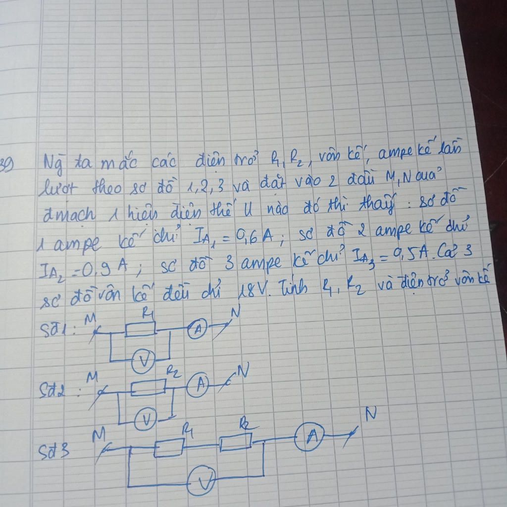 39 Ng ta m ãc cac diên moo R B vân kê, ampe ke laio lượt theo 8d đồ d,2,3 và dat vào 2 daù M,N Oua amach 1 hiels dies the u não do the thaig l ampe bo chi