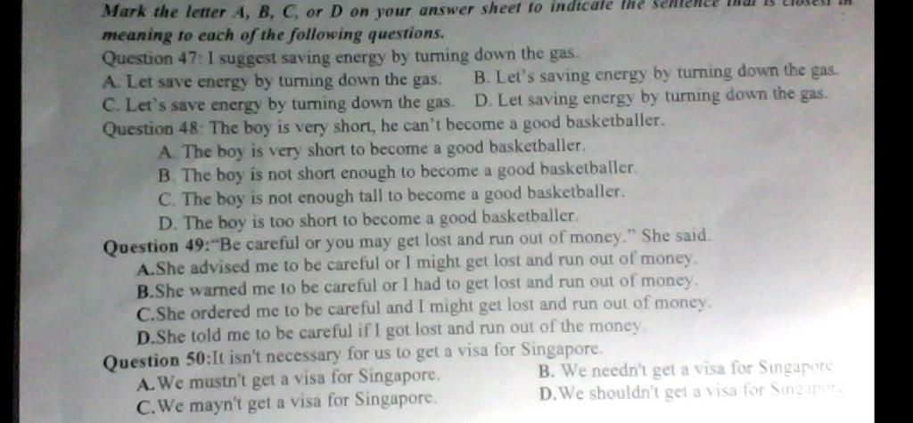 Mark the letter A, B, C, or D on your answer sheet to indicate the sent meaning to each of the following questions. Question 47: 1 suggest saving energy by