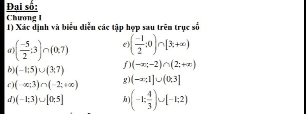 Đại số: |Chương I 1) Xác định và biểu diễn các tập hợp sau trên trục số а) D)(-x;-2)^(2;+x) b)(-1:5)U(3;7) c)(-x;3)^(-2;+∞) d)(-1;3)U[0;5] 8)(-x;1]u(0;3] h