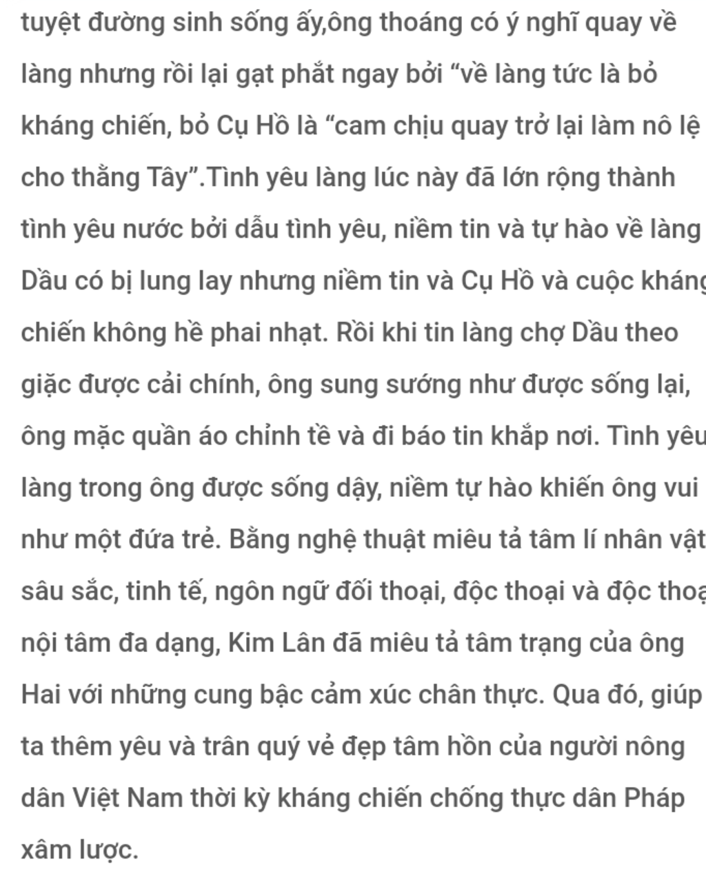 Kim Lân là một trong những nhà văn nổi tiếng với đề tài người nông dân. Ở ông có sự đi sâu, tìm tòi và khám phá mãnh, liệt khai thác những khía cạnh mới về đời sống cũng như tâm lí tình cảm của người nông dân trong kháng chiến. Trong đó nhân vật ông Hai trong truyện ngắn “Làng” thực sự đã để lại cho người đọc nhiều suy ngẫm. Tình cảm của ông với đất nước cũng chính là đại diện cho tình cảm của người dân trong kháng chiến.