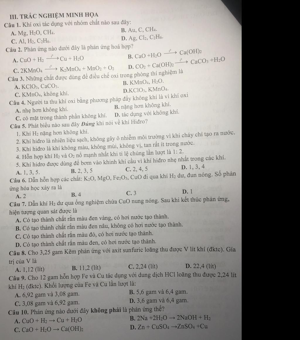III. TRẮC NGHIỆM MINH HỌA Câu 1. Khí oxi tác dụng với nhóm chất nào sau đây: A. Mg, H₂O, CH4. B. Au, C, CH4. D. Ag, Cl2, C₂H6. C. Al, H2, C₂H6. Câu 2. Phản