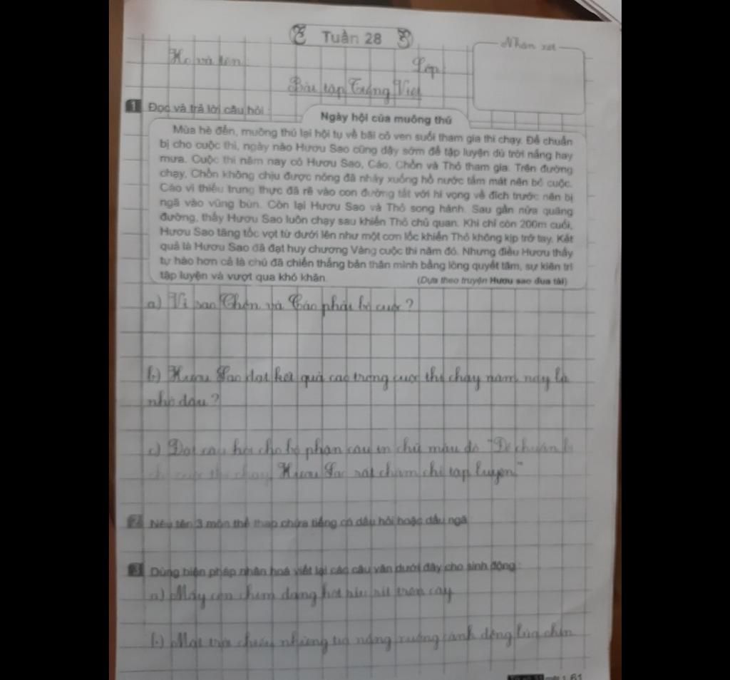 Bài làm: a) * Chồn Chồn không chịu nổi nóng xuống hồ nước mát, bỏ cuộc. * Cáo vì thiếu trung thực nên rẽ vào con đường tắt vọng về đích trước, ngã vào vũng lầy. b) Là vì Thỏ chủ quan Hươu Sao đạt kết quả cao trong năm nay. c) To standard for the running ai was doing? Câu 2 bóng tròn, nhảy cao, võ thuật ... Câu 3 a) Trên cành cây, những chú chim câu líu lo như đang trò chuyện với nhau. b) Ông mặt trời mang những tia nắng thiết kế những cây lúa chín.